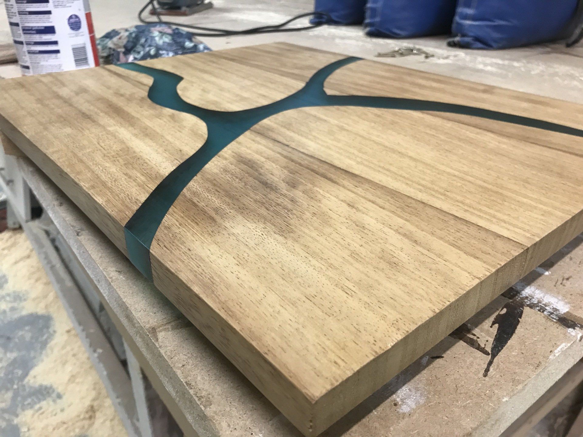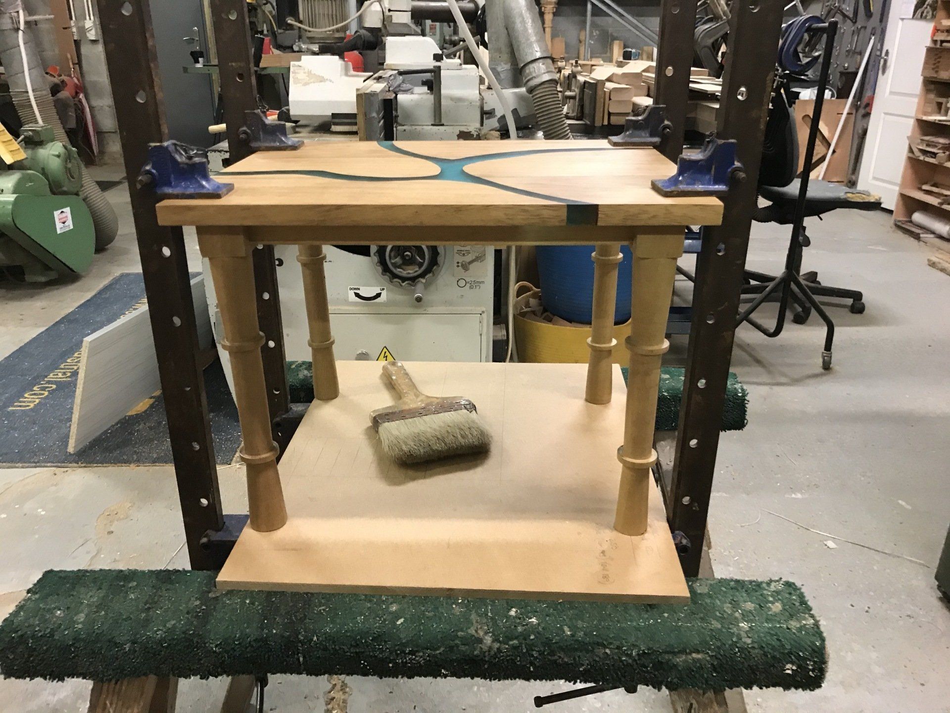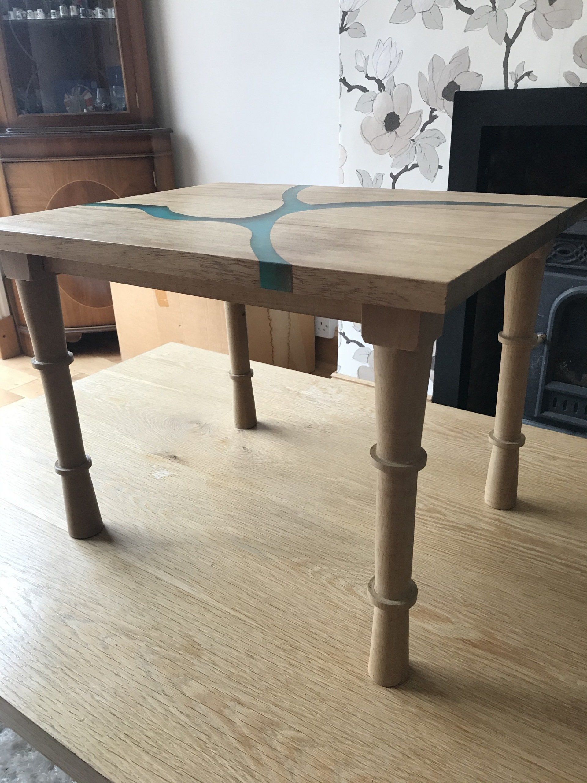 Iroka resin coffee table, hand turned legs, resin fill craft resin with green blue colouring